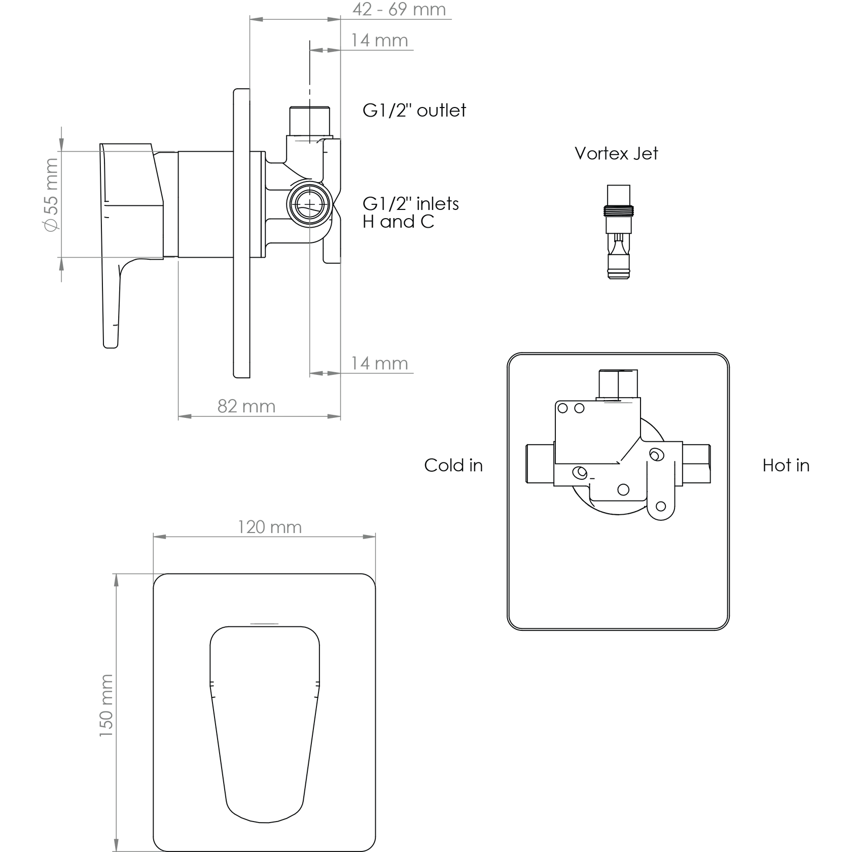Vortex technology delivers superior performance on Unequal Pressure systems. The jets have been designed using the latest venturi technology available to draw lower pressure hot water in using higher pressure cold water. This provides superior flow and temperature control.
